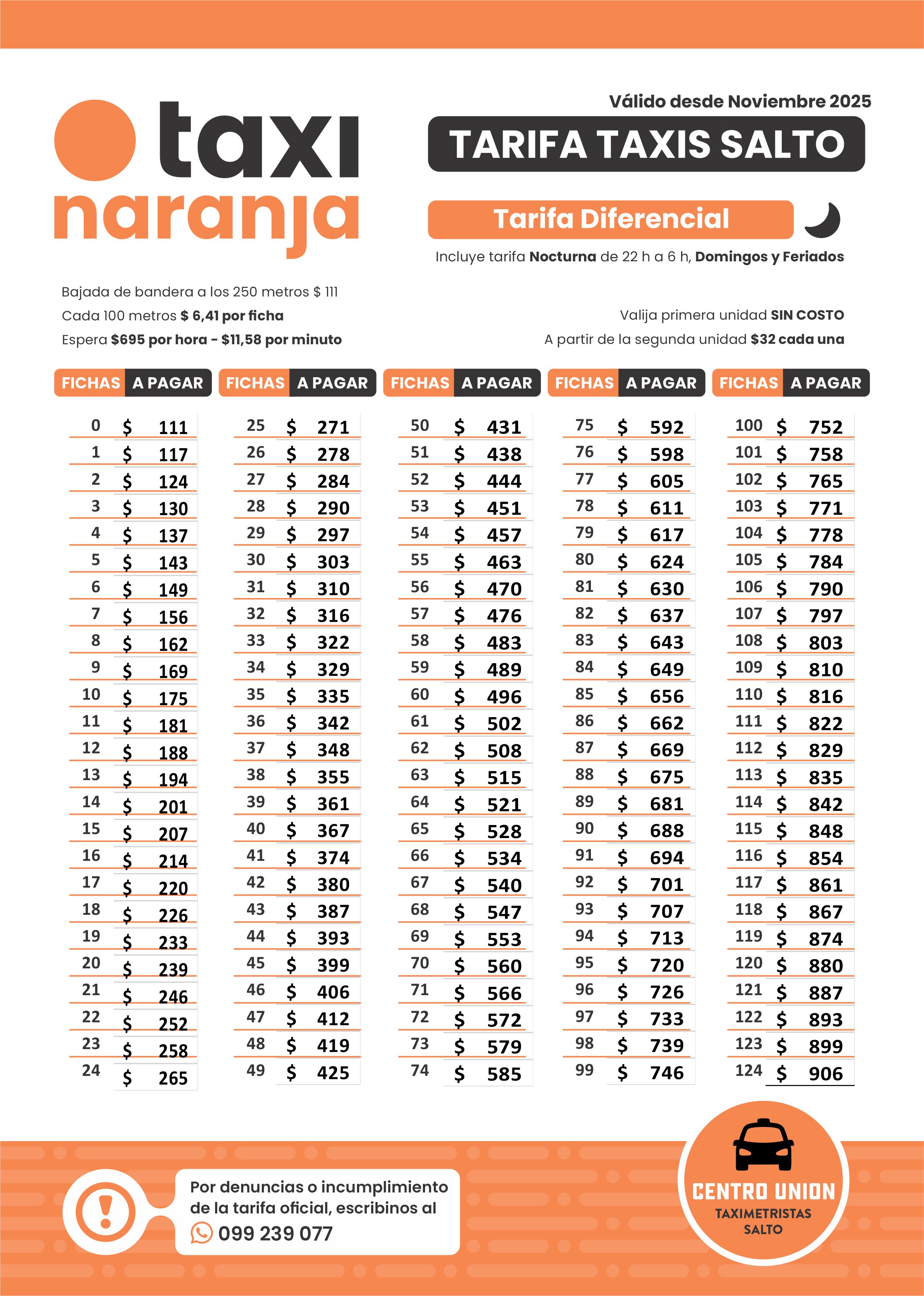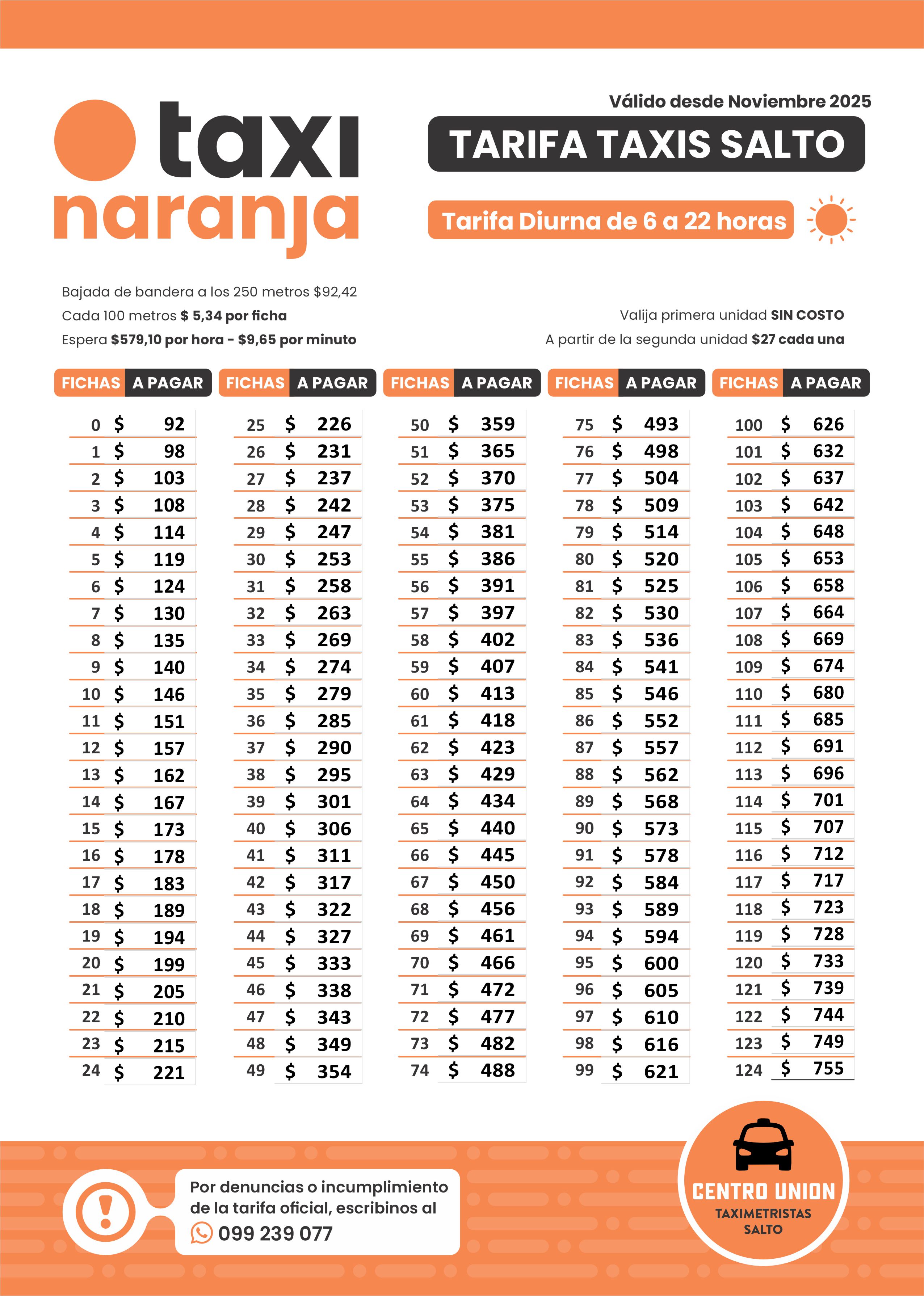 ¡Bienvenido a Taxi Naranja, tu mejor opción para moverte en la ciudad de Salto con comodidad y confianza! Somos más de 30 taxis que formamos parte del Centro Unión Taximetristas de Salto, unidos por nuestro compromiso con un servicio de calidad y precios justos.